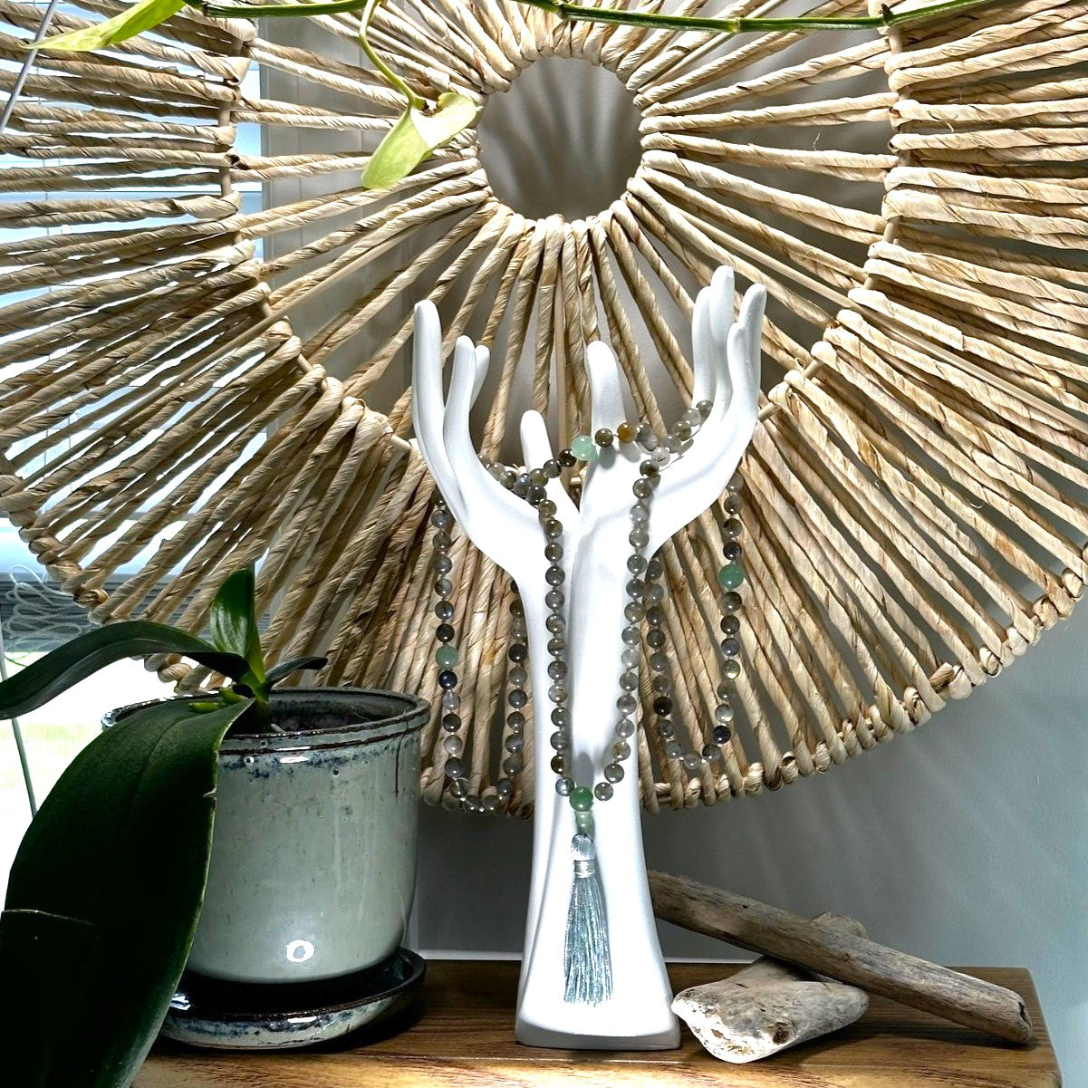 This stunning labradorite mala is crafted using 108 genuine labradorite 8mm beads accented with 3 genuine green aventurine 10mm counter beads and guru bead, and finished with a stainless-steel Om charm. This mala is strung using natural colored 100% silk string.