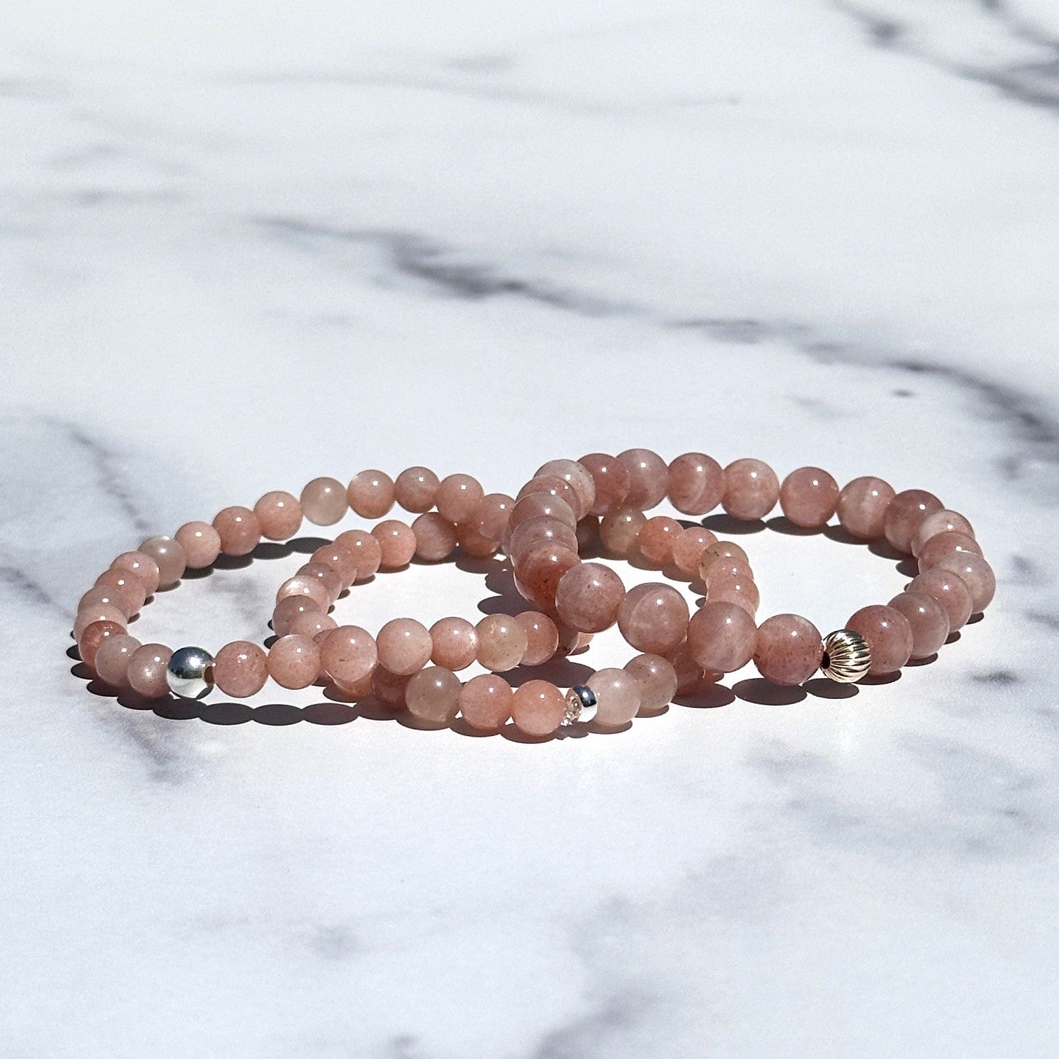 Our Pink Flake Moonstone bracelet is strung using genuine, grade B beads that have beautiful, vibrant color and natural markings free from treatments that alter the natural beauty of the stones. Customize your bracelet by adding 1 or 3 accent beads.